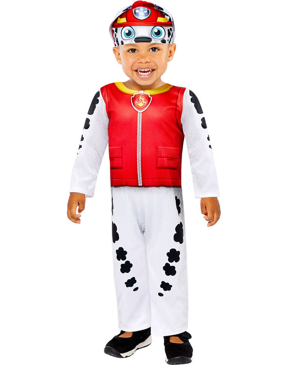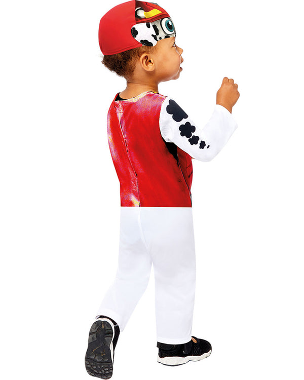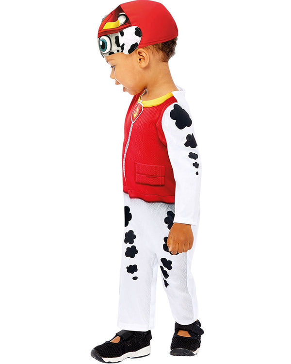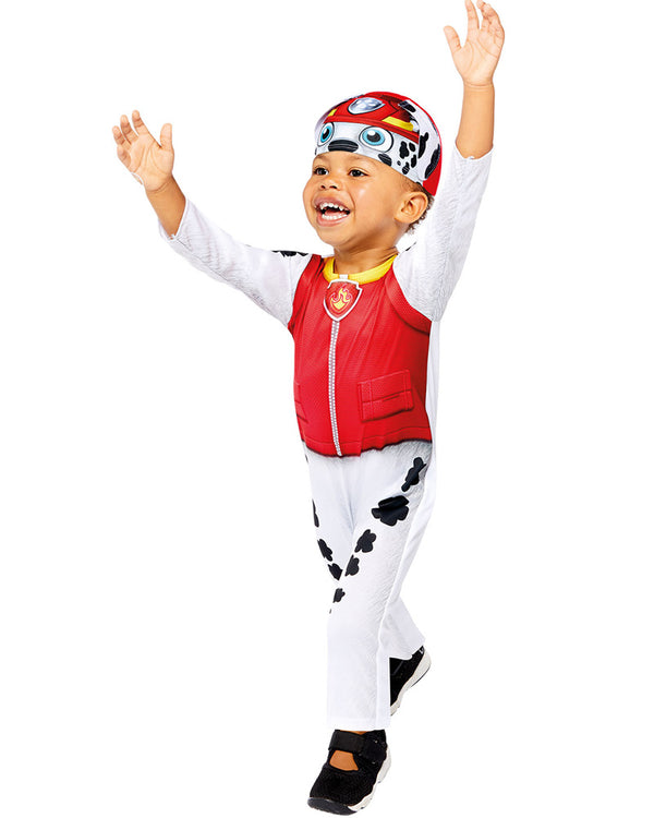 Any little Paw Patrol fan will be sure to adore this Paw Patrol Marshall Toddler Boys Costume. The costume includes a white jumpsuit with black spots on the arms and legs, as well as Marshall's red vest with faux pockets and zipper, as well as velcro closure at rear. Also included is a cap with Chases' face, hat and ears printed on.
