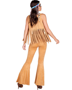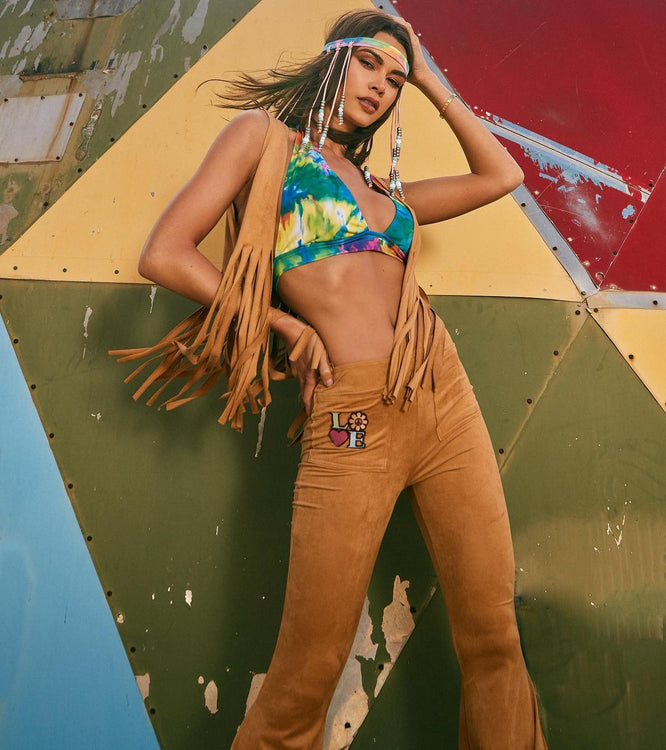 Be a trendsetter at any 60s party or festival in this stunning Peace and Love Hippie Womens Costume. The costume comes with a tie-dye halter neck bikini-style top and matching suede fringed vest and bell-bottom pants with a "LOVE" patch embellishment on the right pocket. Pair with rainbow or tie dye accessories, go go boots and you're ready to party.