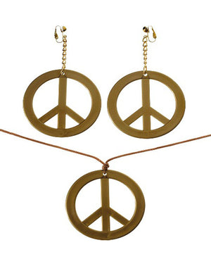 Complete your swinging '60s look with this Peace Sign Earrings and Necklace Set. This set comes with a pair of gold coloured peace sign earrings and a matching necklace. Earrings are for pierced ears, hook design may vary.