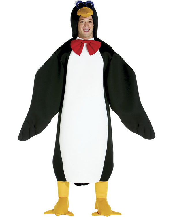 Well designed and extremely cute Penguin Adult Costume. Includes black and white penguin body with head beak and red bow tie as well as two wearable tangerine coloured penguin feet boot covers. Hint: To make this costume look as effective as possible fill the empty space inside the costume with plain butchers paper or cotton/polyester filler.