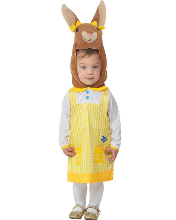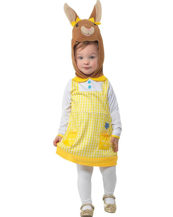 Why walk when you can hop during playtime in this bright Peter Rabbit Cottontail Deluxe Toddler Girls Costume? This adorable costume features a bright yellow and white gingham printed dress with white long sleeves, a yellow Peter Pan collar and yellow cuffs on the sleeves. Attached to the dress are a light brown plush character hood of Cottontail's head and a pair of tall rabbit ears with bright yellow bows. This costume is based on one of Peter Rabbits' little sisters.