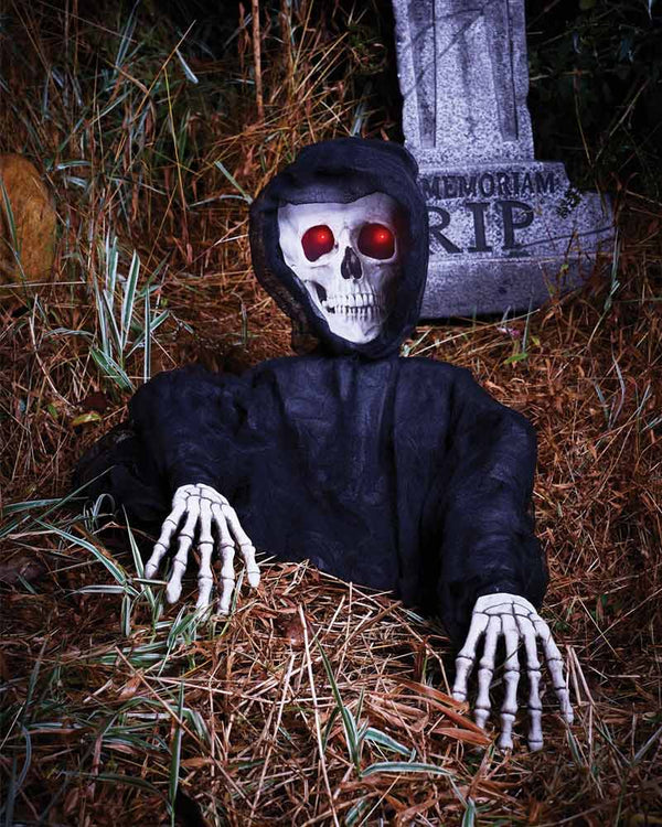 This creepy PhotoReal Light Up Grave Breaker Reaper is perfect for scaring your guests and making them wonder what else is buried beneath their feet. The reaper has two red glowing eyes shining through its skull and a tattered black robe covering his boney body and hands. The arms are posable so you can twist his into any menacing pose you like, and a ground stake is provided to make sure he doesn't get away.