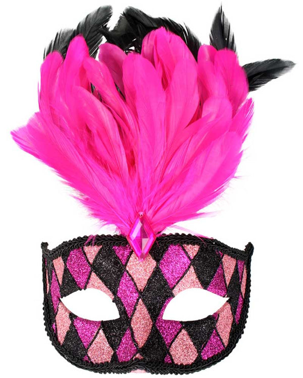 Complete your look at the next masquerade ball with this gorgeous Pink and Black Masquerade Mask with Feathers. This mask features a pink and black harlequin glitter pattern and dramatic pink and black feathers with a pink jewel in the the centre. Ties at the back with a black ribbon. Also great for Carnivale celebrations!