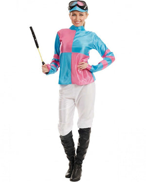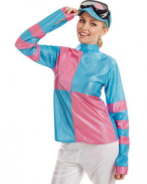 Get ready to jump in the saddle in this Pink and Blue Jockey Womens Costume. The costume includes a pair of full length shiny white trousers, a satin long sleeve top styled with pink and blue squares and stripes on the sleeves. Also included is a matching pink and blue hat as well as a pair of black goggles with clear lens. Just add your own