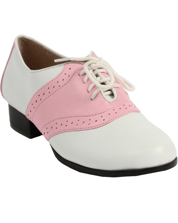 These Pink and White Saddle Womens Shoes are a great way to dress up any 1920's Gangster costume, 1950's Sock hop outfit and more! The shoes come in white with a pink center section and black soles and heel. The shoes also feature a 2.5cm/1in heel. Comfortable and easy to wear with any outfit or costume.