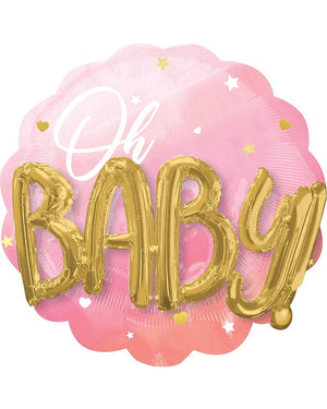 Announce you have a baby girl on the way when you host a baby shower for her and use this Pink Baby Girl Oh Baby Foil Balloon to help announce it's a girl. This eye catching balloon comes in a pale pink in a round shape with 'Oh' in white on the front surrounded by a scattering of small white and gold stars and hearts. Attached to the front is a smaller metallic gold 'BABY!' balloon. Pair up with our range of 'It's a Girl' Baby Shower party supplies including party cups, party plates, tablecovers and more.