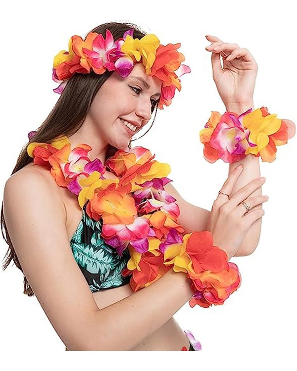 Transport yourself to the tropical paradise of your dreams with our Pink Hawaiian Dancer Womens Costume Set. Whether you're dancing the hula at a Hawaiian luau or channelling your inner Lilo and Stitch fan, this costume ensemble is your ticket to fun. The matching flower lei, bracelets, and headband infuse a touch of island charm, while the green leaf skirt adorned with flowers at the waistline completes the look. Shorter on women and longer on girls, this outfit is versatile for all ages, bringing a vibrant and friendly vibe to any tropical occasion. Get ready to sway to the rhythm of the islands!