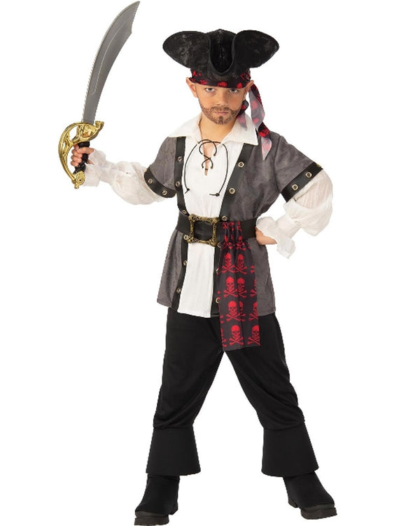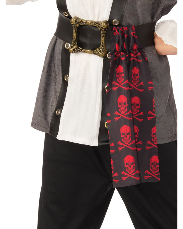 Sail the seven seas and search for buried treasure in this Fearsome Pirate Boys Costume. The costume includes a top with a built-in vest in velour look fabric and attached polyester white shirt with pirate sleeves and lace tie up front. Also included is a pair of black pants with elastic waist and attached shoe covers as well as a faux leather belt with large gold buckle and attached skull print scarf. Of course no pirate would be complete without a hat so also included is a large tricorn style pirate hat with red and black trim.