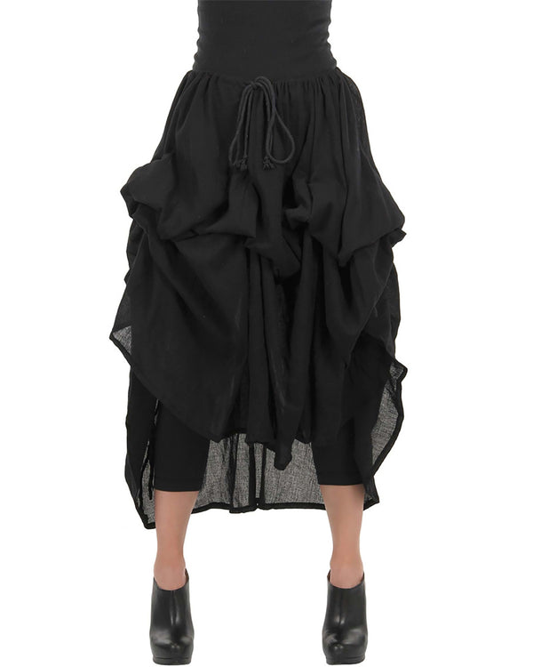 This Halloween check out our Black Pirate Parachute Skirt. Featuring a black ruffled skirt with a braided drawstring waistband and interior ribbon ties to change your straight skirt into a flounced look. Great for your Pirate or period costume.