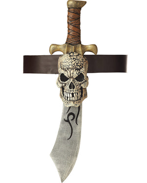 Settle your arguments the pirate way with this Pirate Sword with Skull Sheath 61cm. This great pirate sword is fit for any pirate, from Blackbeard to Davy Jones. This pirate sword has a leather-look belt that secures in place with velcro around your waist. The sword handle comes in a rustic gold design with a brown wrapped leather-look middle, a silver blade with a smiling skull attached to the front of the sword and black curved designs coming out underneath it. The perfect accessory for your pirate costume.