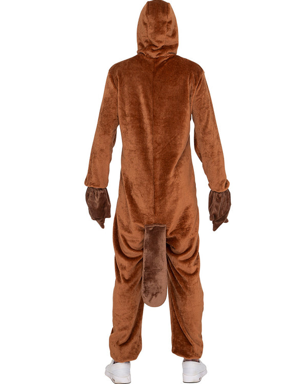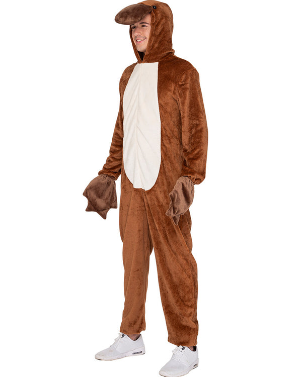 Splash your way out of the rivers as you dress the part at your next fancy dress event or an animal themed party in this Playful Platypus Deluxe Adult Costume. This super comfy costume comes in a jumpsuit for a quick and easy costume choice and features elastic around the cuffs and ankles for a comfy fit. The jumpsuit comes in a fluffy chocolate brown with a cream coloured chest and a zipper down the front for an easy fitting. The hood is fitted around the head and features a dark brown soft bill with a pair of black beady eyes at the top. Around the back there is a dark brown soft tail and to finish the platypus look is a pair of soft dark webbed shaped gloves.