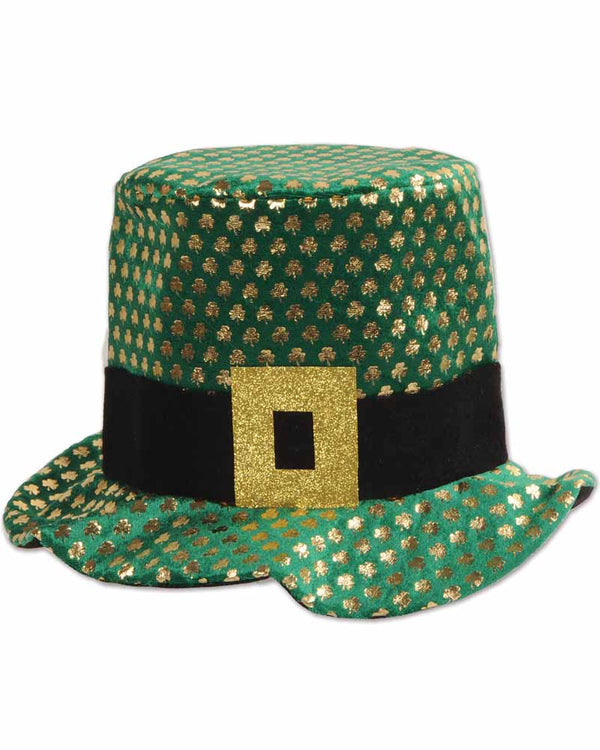 Celebrate Saint Patrick's Day in true Irish style donning this Plush Gold Shamrock Hat! This hat is styled similar to a traditonal top hat and is green with gold shamrock embellishments and a printed on belt. Perfect for pub crawls or any St. Patrick's Day events!