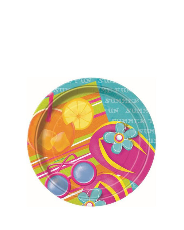 Finish setting up your pool party table with our Pool Party 18cm Desert Plates Pack of 8. The plastic desert plate measures 18cm perfect for serving your guests desert or nibbles at your summer pool party! The napkin is printed with a cool fruity beverage, a pair of pink thongs, beach towel and pink glasses, all on a blue summer fun background! Combine with our range of pool party themed party supplies including party cups, party plates, tablecovers and more.