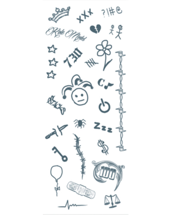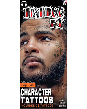 You'll love our Popstar Character Tattoo. Featuring a pack of tattoos, styled with intricate images including bullets, hearts, flowers, barbed wire, stars, and much more. Just cut out out the tattoos and place them in the desired location. Before applying with water just make sure your skin is clean of oils and makeup.