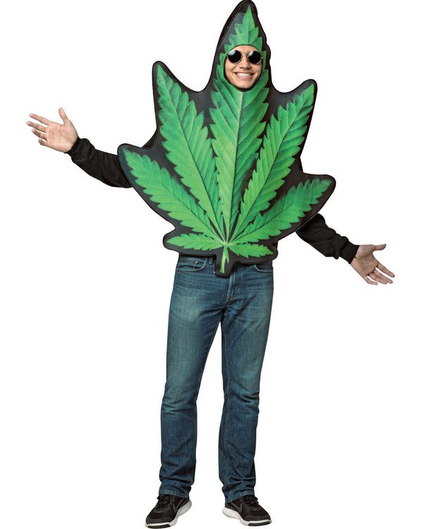 Have the chillest time at your next dress up party wearing this Pot Leaf Adult Costume. This costume features a tunic in the shape of a green cannabis leaf, with the leaf printed on the front. At the top of the tunic, there is a hole to place your face through. A truly hilarious costume.
