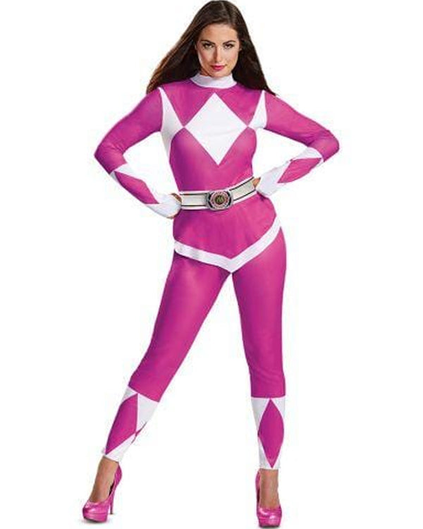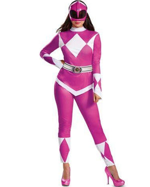 Join the elite team called the Power Rangers and defeat all the bad guys that come to Earth in this Power Rangers Pink Ranger Deluxe Womens Costume. This costume comes as a pink jumpsuit with white detailing and trims, and an attached belt with belt buckle. Put on the included pink half mask that looks like the front of the Ranger's helmet and you'll look just like the Pink Power Ranger from the classic 90s show. Perfect for a group costume for your next fancy dress party.