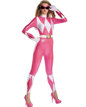 Morph yourself into a super teen with lots of attitudes and a goal of defeating evil witches in this Power Rangers Pink Sassy Bodysuit Womens Costume. This costume is based on the outfit worn by the Pink Power Ranger in the hit tv series 'Power Rangers'. The costume includes a pink jumpsuit with white diamond-shaped detailing and trims, and an attached backed white belt buckle with the Power Rangers emblem buckle attached at the front. There is a pair of white gloves and pink wraparound design sunglasses based on the mask worn by the Pink Power Ranger. It's Morphing time!