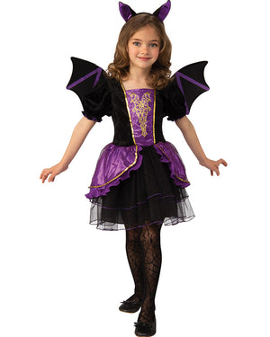 Go classic this Halloween with this Pretty Bat Girls Costume. The costume features a dress with black underskirt and purple lacy tulle peplum for added fullness. The majority of the dress is black, with puff sleeves and a purple panel with gold detailing down the centre of the bodice. Also included is a set of black and purple bat wings that attach with elastic straps around the shoulders. Of course to complete the look is a set of purple shiny bat ears attached to a headband.