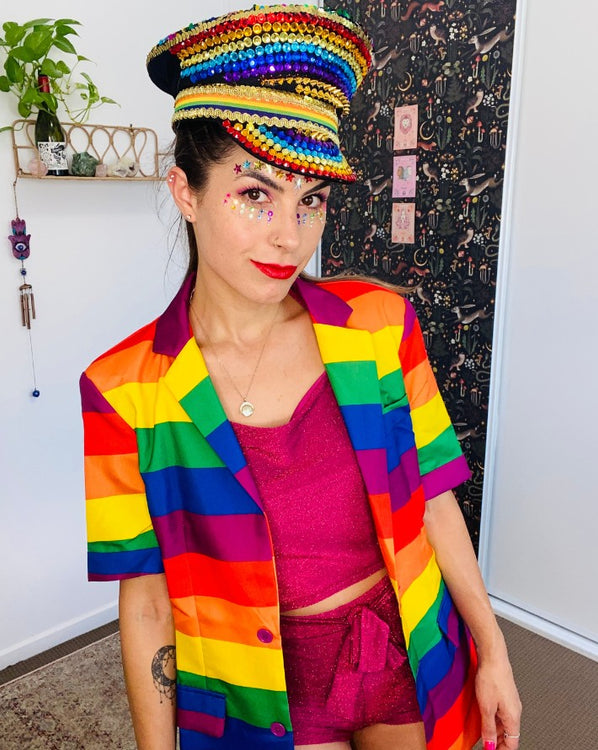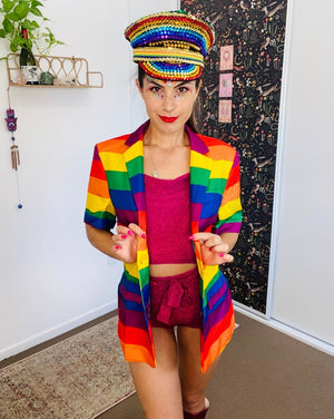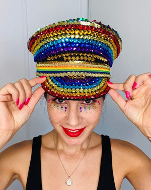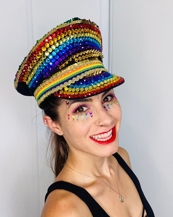 You’re guaranteed to have the best headwear at any event when you wear this Pride Rainbow Festival Hat. The hat is covered in rainbow gems with gold spikes at the front and rainbow ribbon running along the circumference. Perfect for Mardi Gras or festivals!