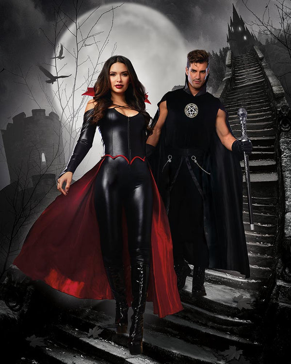 Roam the dead of night in this Princess of Darkness Womens Costume. The costume includes a black faux leather jumpsuit with zip front, cold shoulder design as well as an attached red vampire collar and strapping across the chest. To complete the look the jumpsuit also features an attached skirt that covers the back and is black on the outside and red on the inside.