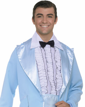 Make an impression on your next date or next fancy dress costume with this dashing Prom Ruffled Shirt front. This retro accessory is a white ruffled shirt front with black stitching along the ruffled edges with attached collar and bowtie. Fastens with velcro around the neck.