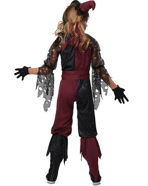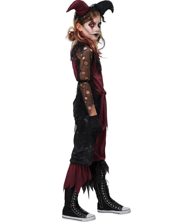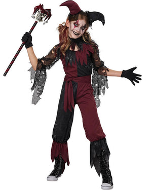 This Psycho Jester Girls Costume is perfect for Halloween to give your friends a big scare. The costume comes with a two-tone long-sleeved top in black and red with a tattered neckline and tattered black mesh sleeves, a matching pair of black and red two-tone pants with an elastic waist and tattered cuffs and a red fabric waist tie. Also included to complete this creepy jester costume is a tattered black, red and mesh collar and a headpiece with matching black and red horns on a headband that look like the spokes on a jester's hat. Pair with gloves, shoes and some terrifying makeup for the ultimate Halloween costume.