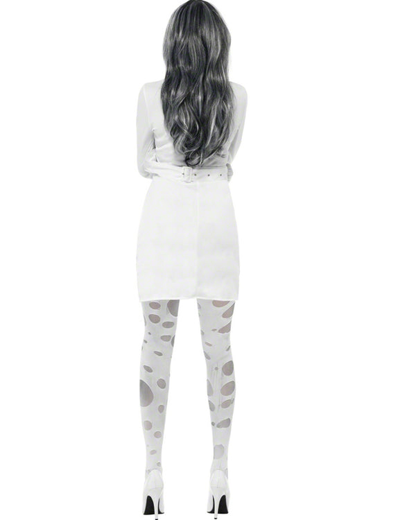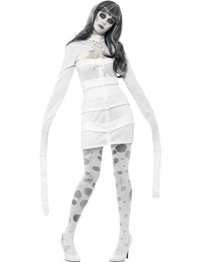 From the asylum to the streets comes this Psychotic Restraint Womens Costume. The costume features a white long sleeve dress with lace up detail on the bust and buckles running across the front. As if to mimic a straight jacket, the sleeves of the dress also feature a buckle at the end, meaning you can either buckle your hands behind your back or let them stay free. Go nuts this Halloween.
