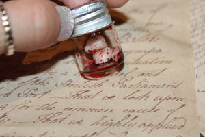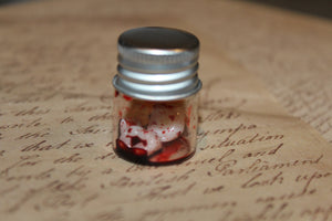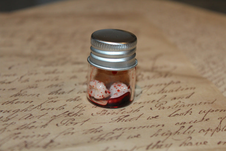 - Glass specimen jar with three resin teeth and fake liquid blood.