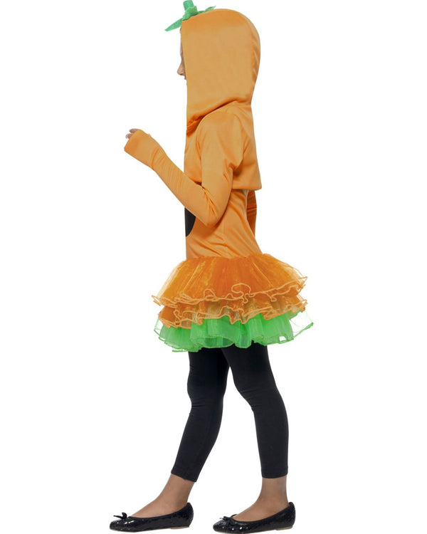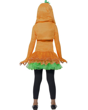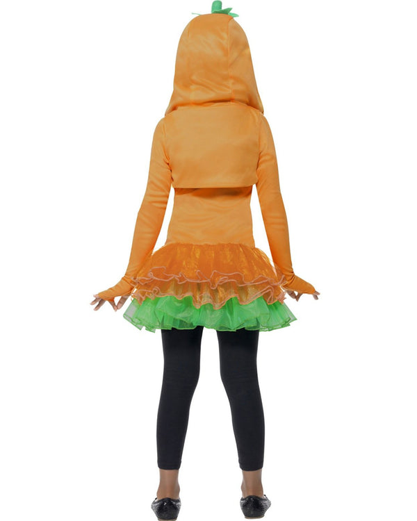 You'll be cutest pumpkin in the patch with this Pumpkin Tutu Dress Girls Costume. The costume comes with an orange long sleeve dress with a friendly jack-o-lantern style black face on the front. The skirt of the dress also flares out into an orange and green layered tutu. To complete the look, also included is a long sleeved cropped orange hooded jacket with green inner lining that features a green pumpkin stem at the top!