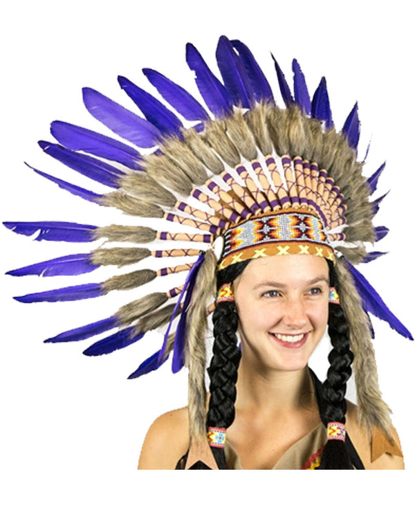 Get into the festive mood in this Purple Small Native American Headdress. A beautiful headdress of traditional Native American design made with a great amount of care and high attention to detail. The headdress features genuine purple feathers extending from brown fur embellishments. The intricate design is all supported from the base of the multicoloured headband with two additional brown fur embellishments and four purple feathers attached to complete the headdress.