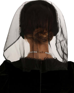 - Black organdy veil attached at the back of the headband.