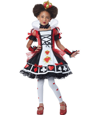 Do you often find yourself turning crimson with fury? Get into true character with this Queen Of Hearts Deluxe Girls Costume. Decorated with card suit symbols, an upright collar and puff sleeves, this detailed little number also comes with fingerless gloves, a choker, leggings and a crown headband. Now you're ready to win a match of croquet! Perfect for dress up parties, themed events and much more!