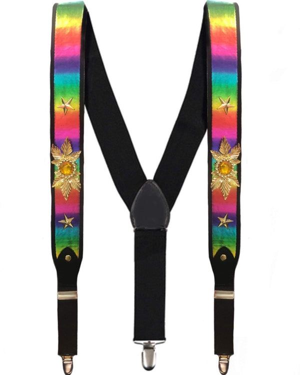 Complete your Mardi Gras rainbow or festival outfit with these bright Rainbow Bling Suspenders. These black suspenders feature a striped rainbow design printed along the outside and decorated with gold jewel metal details. Pair with our other range of rainbow accessories.