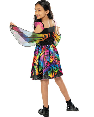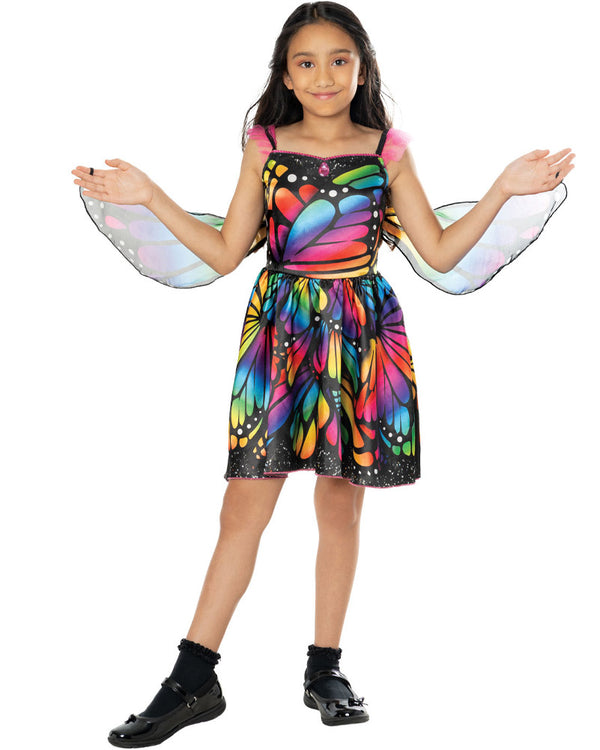 If your child loves the natural world and the colours of the rainbow, they'll love dressing up as a bright and beautiful butterfly with this Rainbow Butterfly Girls Costume. Included is a knee-length, spaghetti strap dress in black, with printed rainbow butterfly wing design, pink tulle shoulders, and detachable, wire-framed wings. A beautiful and classic dress-up that lends itself to a variety of events, from dressing up as a butterfly character from a book for Book Week, to flying around the house and garden at a special occasion. Add some colour to her costume wardrobe with this beautiful butterfly costume.