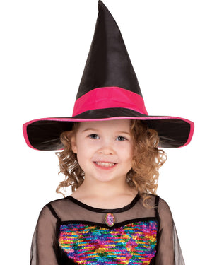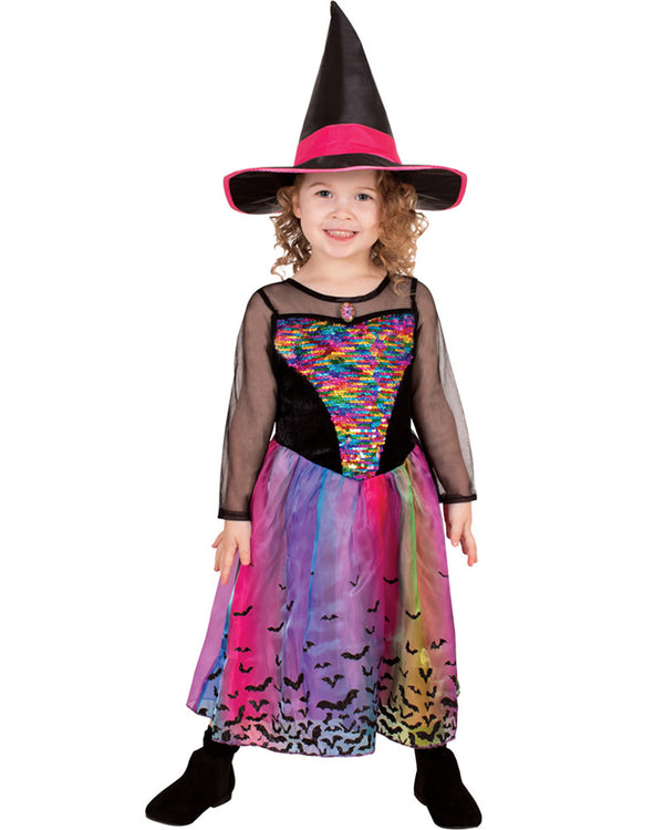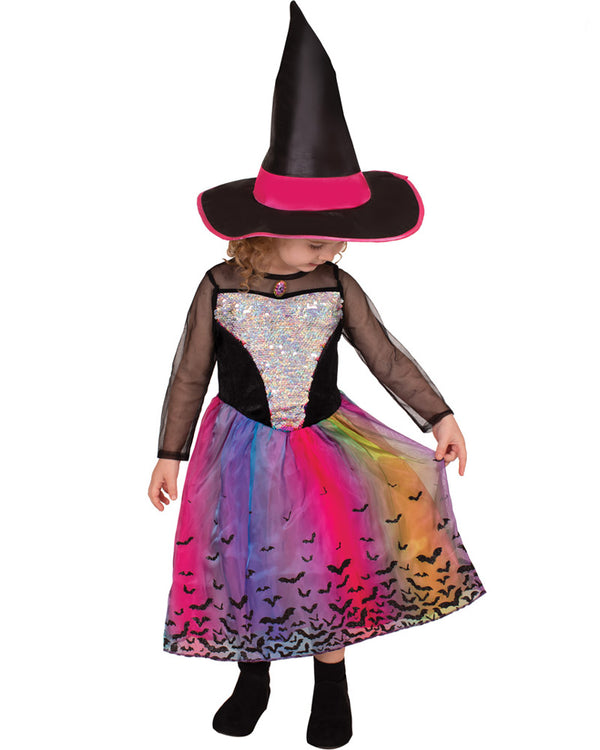 Add a touch of magic to Halloween or Book Week with the Rainbow Colour Magic Witch Deluxe Girls Costume. This cute witch dress features a sequin front panel on the bodice that changes colour from silver to rainbow when you brush over it with a hand. The dress also features an attached skirt with ombre colours and glitter bats, and sheer sleeves to complete the witchy look. The matching black pointed witch's hat with pink trim and faux jewel pendant complete the spooky yet enchanting look. A great choice for little ones this Halloween or Book Week.