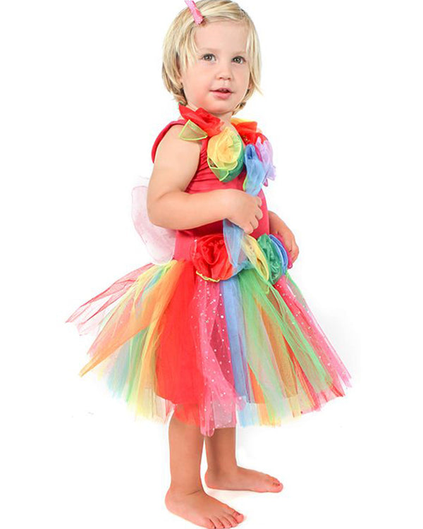 Your little girl will look gorgeous in this Garden Fairy Rainbow Girls Toddler Costume. This costume comes with a rainbow dress with rainbow flowers along the neckline and waist. The dress comes attached with a pair of matching wings to complete the look.