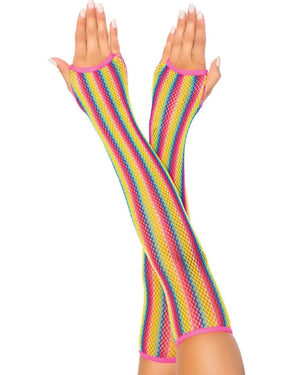 Cover your arms in vibrant colours as you wear these Rainbow Fishnet Arm Warmers for your next event. These arm warmers are fishnet and are printed with a bright vertical rainbow design. The accessories start at the palms and end just above the elbows and also come fingerless. A fun pair of arm warmers for your Mardi Gras, festival or rainbow themed event.