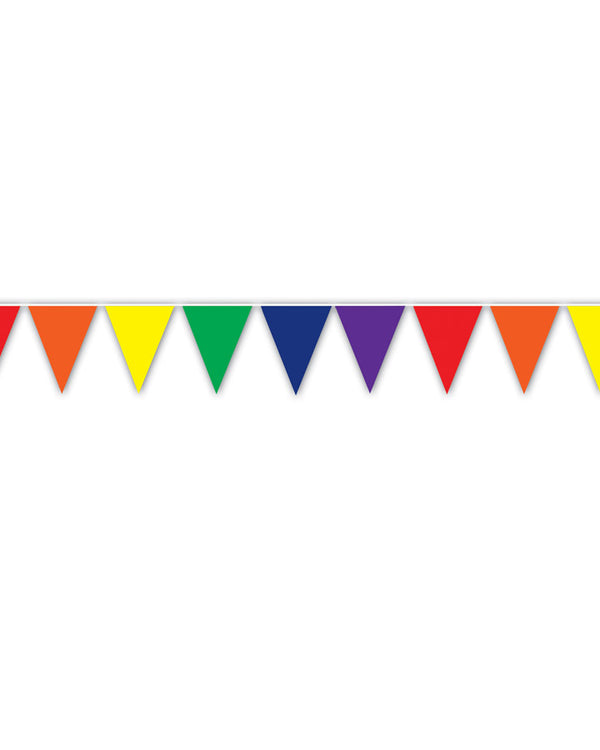 Party in style with our range of Rainbow party accessories and decorations like this Rainbow Pennant Banner in all the colours of the rainbow! Red and yellow and pink and...you know how it goes! Measuring 3.7m x 25cm and made from all weather poly material. The banner features 12 pennants along the string and is perfect for your Mardi Gras celebrations.