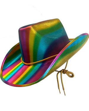 Bring some bright colours to your cowboy costume with this Rainbow Pride Cowboy Hat. This cowboy hat comes in a holographic rainbow finish and not only is great for a cowboy but a great accessory to add to your Mardi Gras or rainbow costume. Pair with our range of cowboy or other mardi gras accessories.