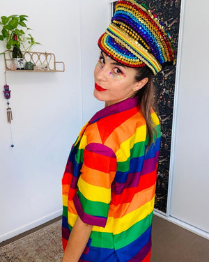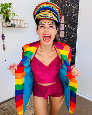 Add some colour to your wardrobe with this swanky Rainbow Summer Suitmeister! With short cuffs at the knees and elbows, this Suitmeister is made with the heat in mind. Including a horizontal rainbow tie, jacket and shorts you'll have everything you need to look the part at any event, from a party, the races, to Mardi Gras! All Opposuit pants and jackets are lined with a small amount of additional fabric so that if desired, they may be tailored to your exact length and fit by an alterations business or tailor. Also, the waistband of trousers can be adjusted 2 sizes larger or smaller than the original size.