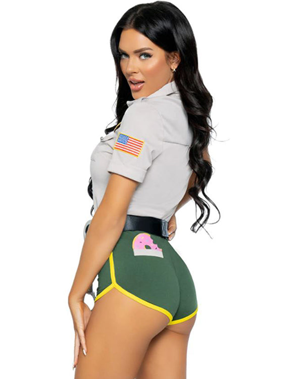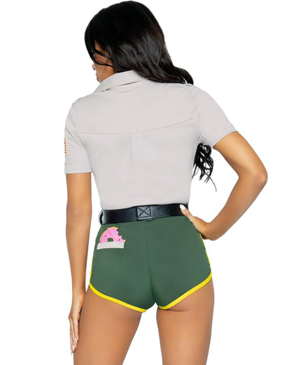 No one will resist being arrested by you when you're wearing our Ranger Hot Cop Womens Costume. This all-in-one sexy ranger costume features a grey collared top with police badge and logo accents, a black belt with a faux black pouch and green and white dolphin shorts with a yellow trim. In addition, the shorts are styled with a doughnut print on the back. The costume is made from stretchy form-hugging material that also comes complete with a pair of toy handcuffs.
