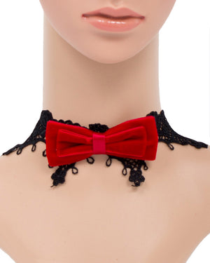 This Red Bow Gothic Lace Choker is a great accessory to complete your burlesque or Halloween look. Features a black lace collar with an attached red velvet bow with an adjustable hook and chain fastening.