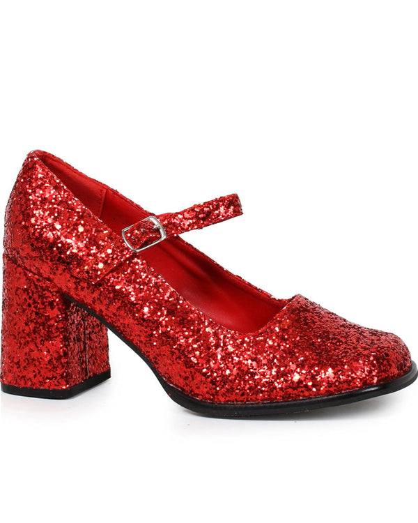 Compliment your next fairytale or storybook costume with a pair of these Red Glitter Eden Heel Womens Shoes. These heels are glittering red and feature a silver buckle, a rounded toe design and a block heel at the back. Perfect for mixing with any number of costumes; princess, devil, or team colours.