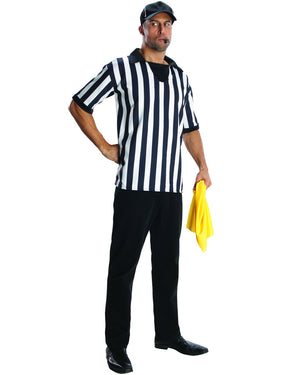 Be ready to make the call in this Referee Mens Costume Kit. This costume comes with a black and white striped shirt, black hat, whistle and yellow flag.