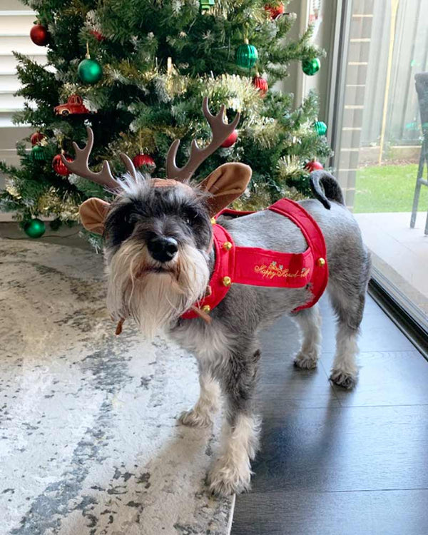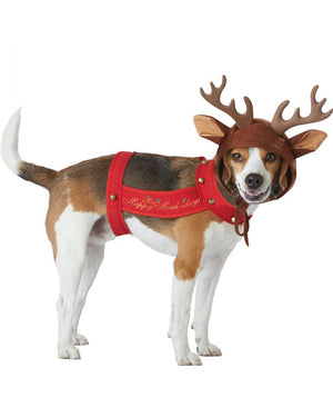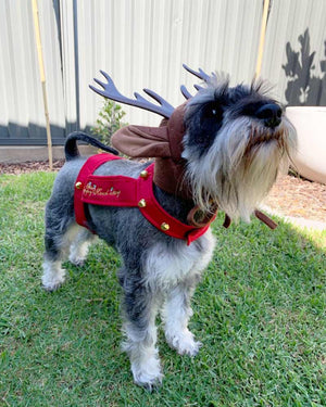 Get your pooch in on the Christmas spirit and strap this Reindeer Dog Pet Costume on them. They'll feel like one of Santa's reindeers, pulling the sleigh to bring presents to all the sleeping children. This festive costume comes with a red harness made of soft red plush fabric, with gold bells attached and embroidered on the side in calligraphy is 'Happy Howl-days' with holly above. A reindeer costume wouldn't be complete without antlers! Headpiece sits on your pooches head like a hood and is secured by tying under chin. Comes in soft brown plush fabric with two reindeer ears on each side and two antlers on top. Grab yourself some matching reindeer antlers for yourself or your children for a Happy Christmas!