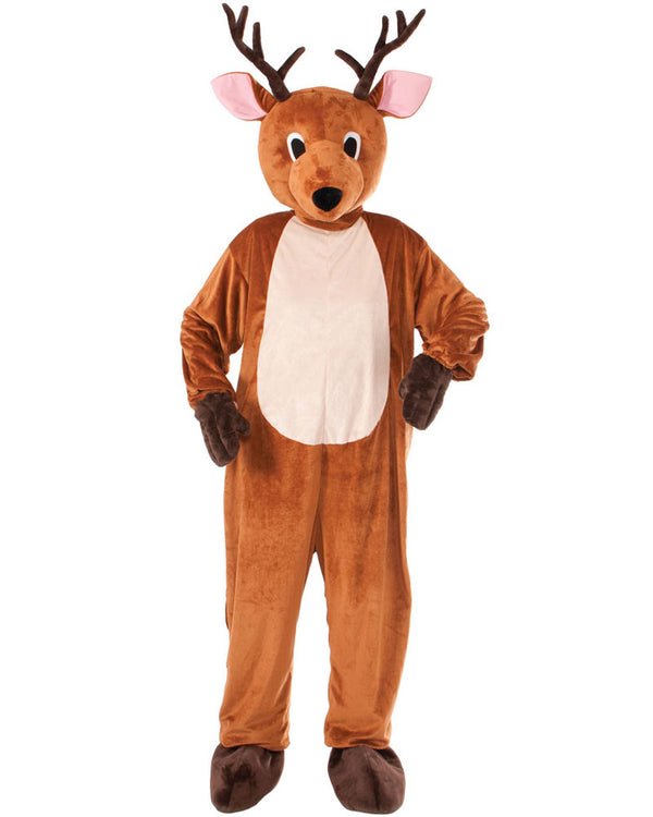 This super soft Reindeer Mascot Adult Costume features a soft velour jumpsuit with a white belly and attached mittens and shoe covers. The over the head mask with ears and antlers completes the look. You will have snow much fun in this Reindeer Adult Costume!
