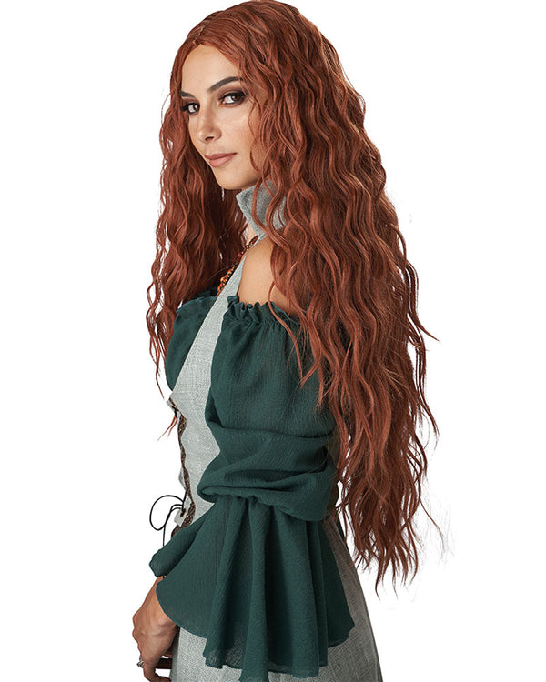 Any fair maiden of medieval times needs this Renaissance Maiden Long Auburn Wig to finish off their outfit for authenticity. The wig features long beautiful wavy strands of hair in a rich auburn colour that comes down to about the waist, as well as featuring a classic middle part and a layered cut. It's absolutely perfect for finishing off medieval or renaissance costumes, Queen or princess costumes, fairy or mermaid outfits and more. Wear a wig cap for added comfort and to keep your own hair under wraps.