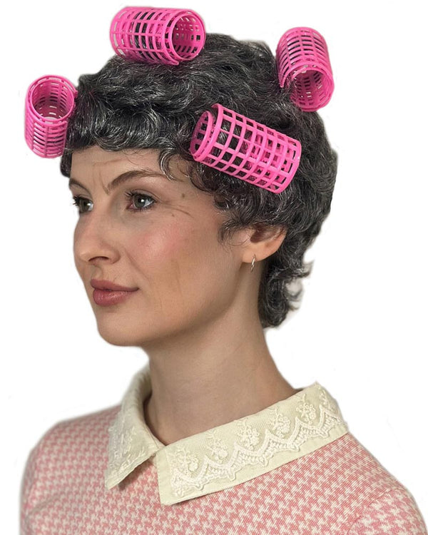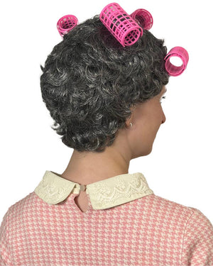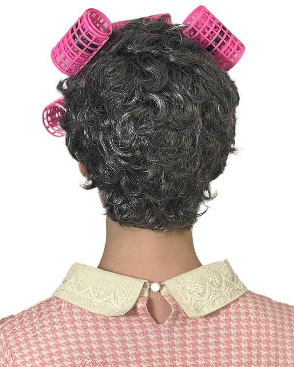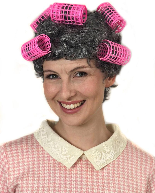 Embrace retro beauty techniques with this Retro Housewife Short Grey Wig with Curlers. This hilarious throwback wig features a classic short grey style with five pink curlers for an on the go look. With extra-long fibres designed to wrap around the curlers and an adjustable strap cap for a comfy fit, this wig is perfect for costume parties, theatrical performances, or just giving off strong grandma energy. Wear a wig cap for added comfort and to keep your own hair under wraps.