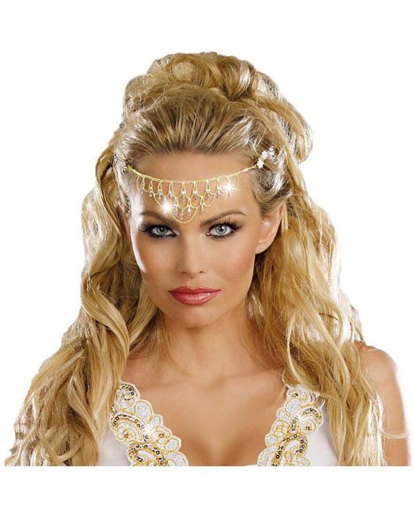 Get your glam on with this glittering Rhinestone Headpiece! This headpiece is gold and features dangling rhinestones and has clips on either side of the headpiece that clip straight into your hair. Perfect with Greek, Roman and Egyptian costumes, as well as, Medieval and princess costumes!