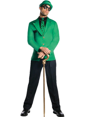 Be the bad guy in this Riddler Mens Costume, perfect for your Batman or villains party. The costume features a green bowler hat, jacket with attached shirt front and tie, and eye mask. Riddle me this...